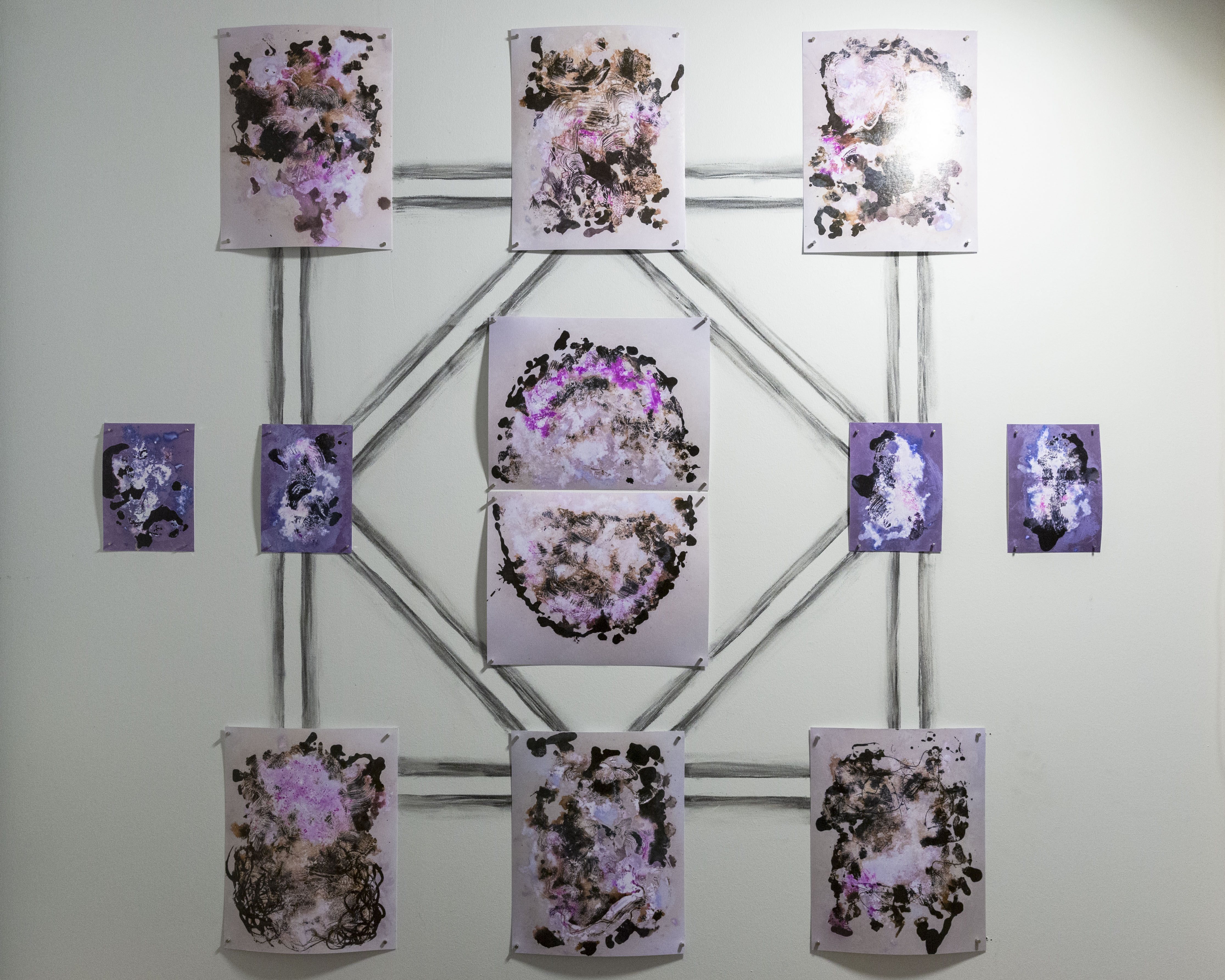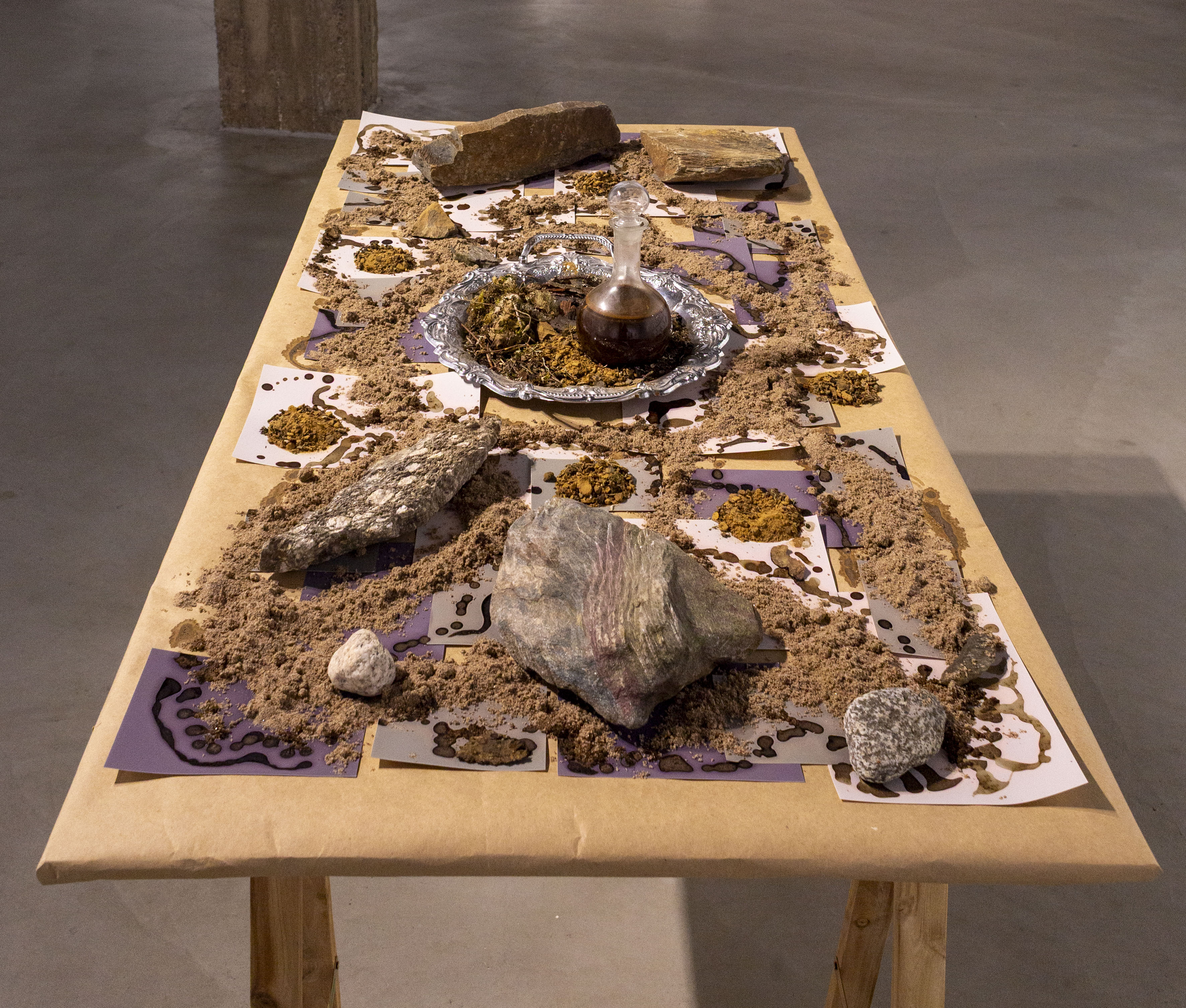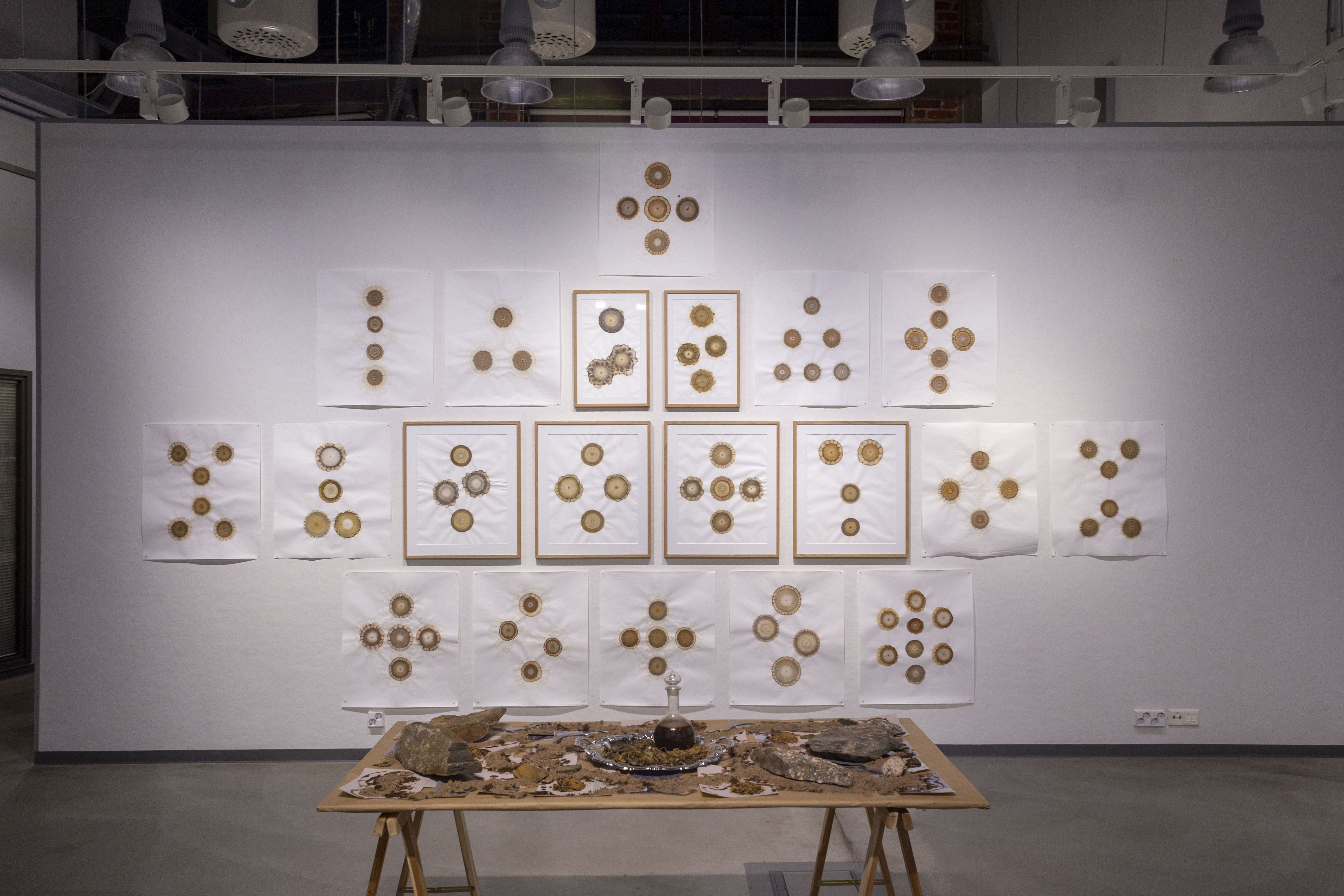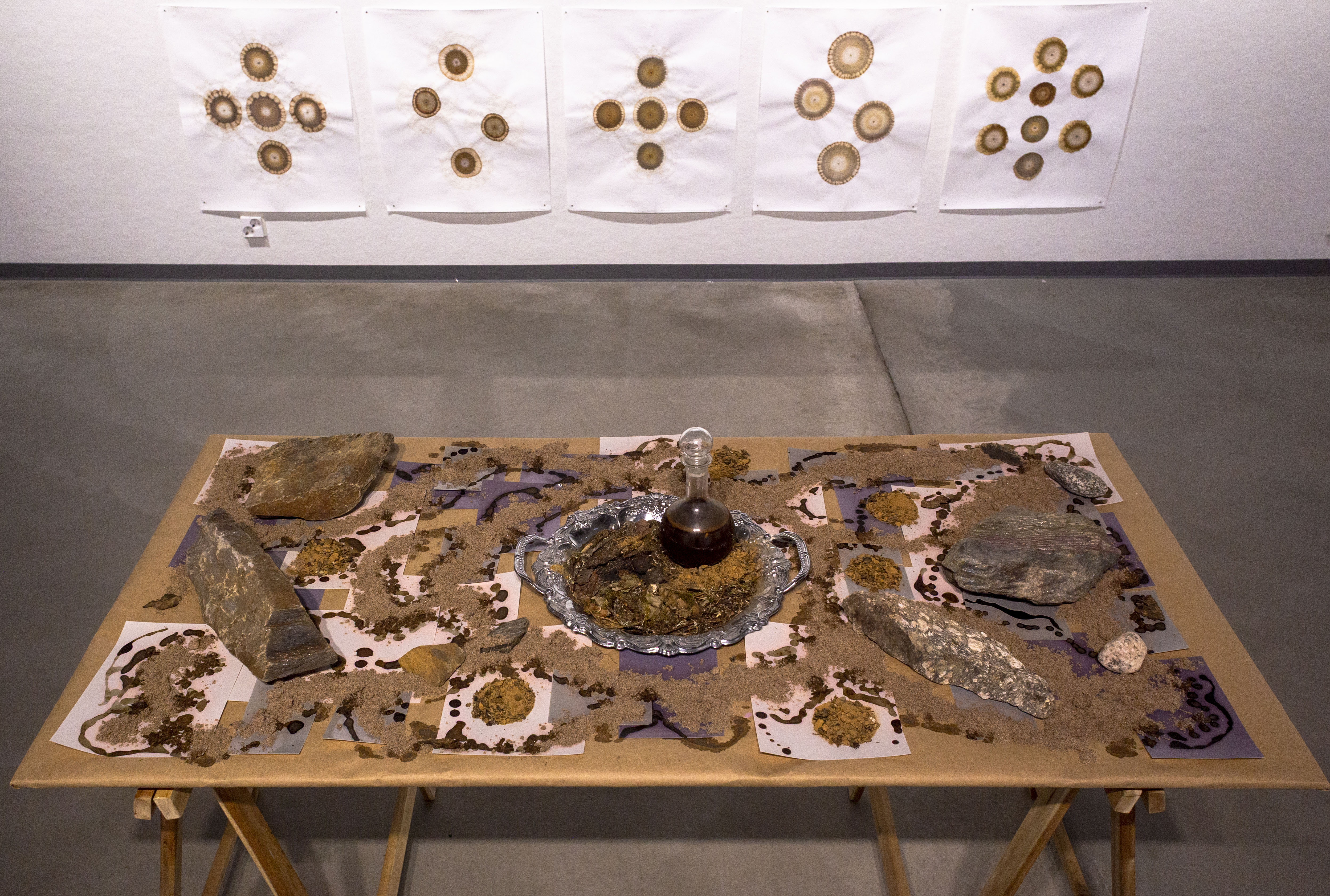 Ensimmäinen osa installaatiota on pöytä, jonka päälle asettelin valoherkkiä valokuvapapereita ja mm. kiviä sekä hiekkaa valottumaan näyttelyn ajaksi. Toinen osa seinällä koostuu hiilipiirros ja lumen-printti & kemigrammi-muodostelmasta, minkä printit toteutin samalla metodilla kuin pöydän kuvat. Kuva-aiheena alttarimaiselle kokonaisuudelle on tamperelaisen taidetalon (ex-toimistotalon) pihapiiristä kerätty maaperä, joka sitoo teoksen ympäristöönsä ja toimii katsojan tulkittavana ennusteena.