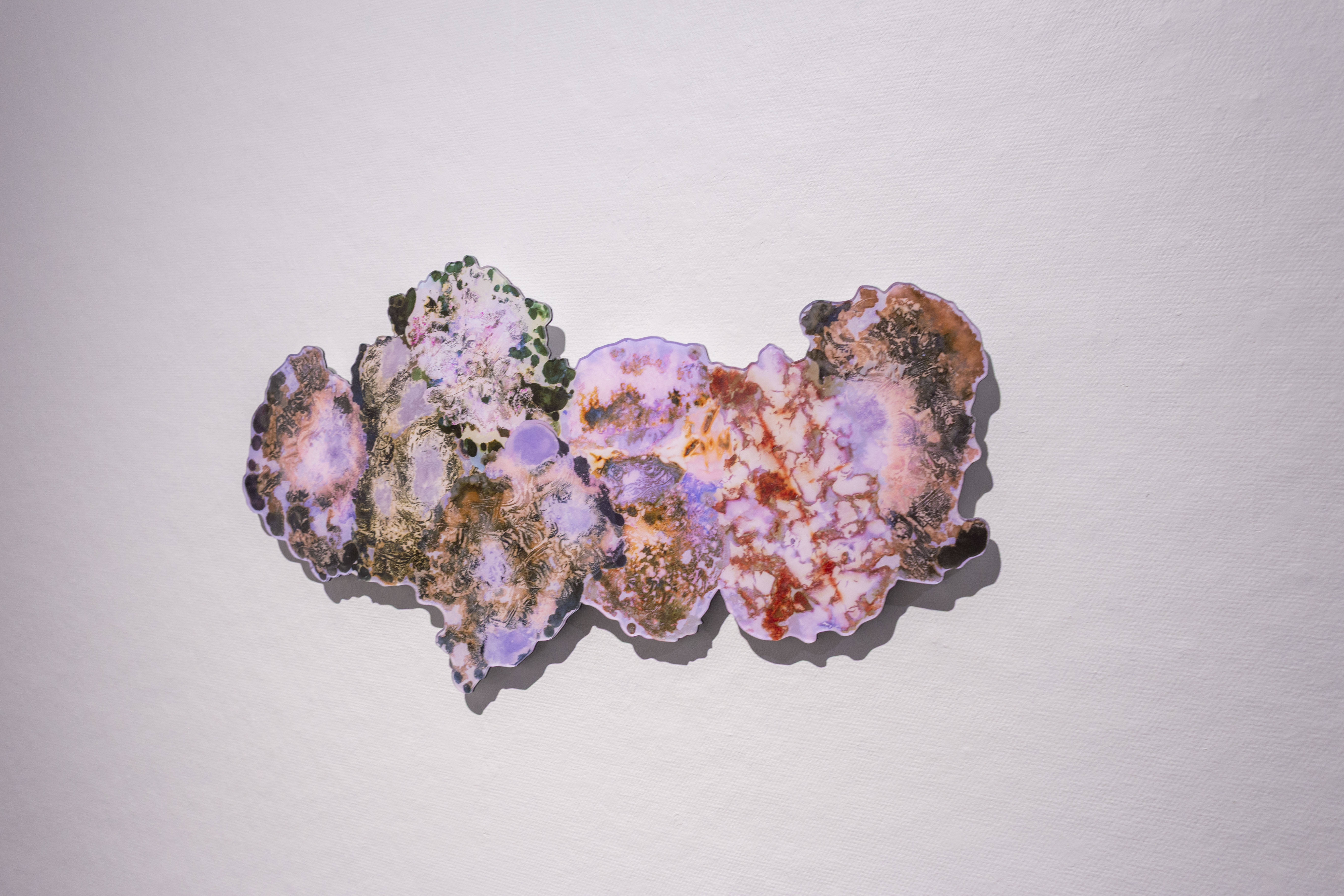 Moberg’s work is inspired by some ideas of the book by philosopher Emanuele Coccia: The Life of Plants: A Metaphysics of Mixture (2020), according to which the earth is our planetary brains, the stone flesh of the planet and with it an active communicator through the underground roots and minerals of plants. Moberg is also interested in the state of our planet’s cosmic interaction, which she experiences as a communicator of meteorites that strike the Earth. In her exhibition works, she examines meteorites and the deep time crystallizing in the landscapes of craters and trace fossil rocks from Kilpisjärvi.